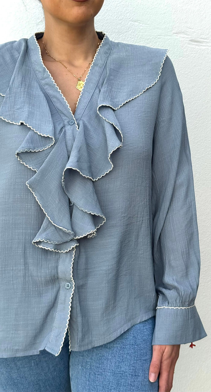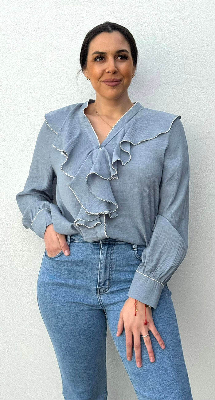 Destaca por su elegante cuello con volantes y ribete ondulado en contraste.