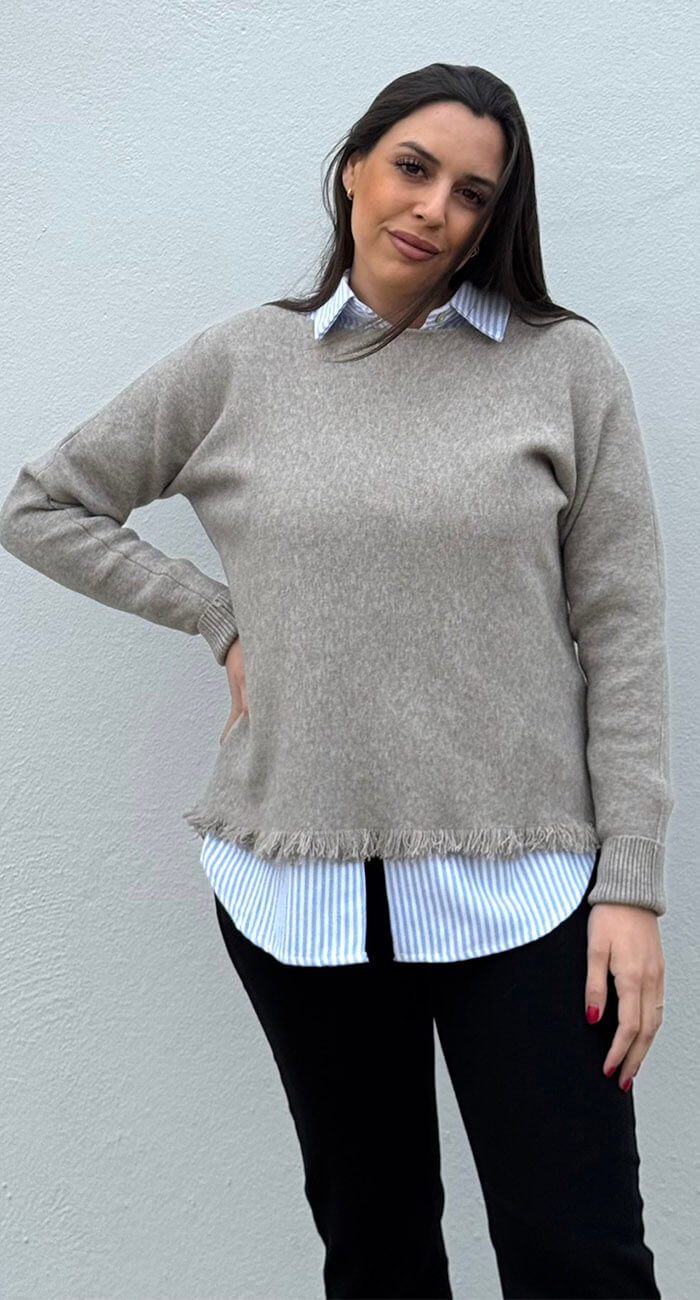Jersey de punto, presenta cuello amplio tipo barco y mangas largas con puño acanalado.